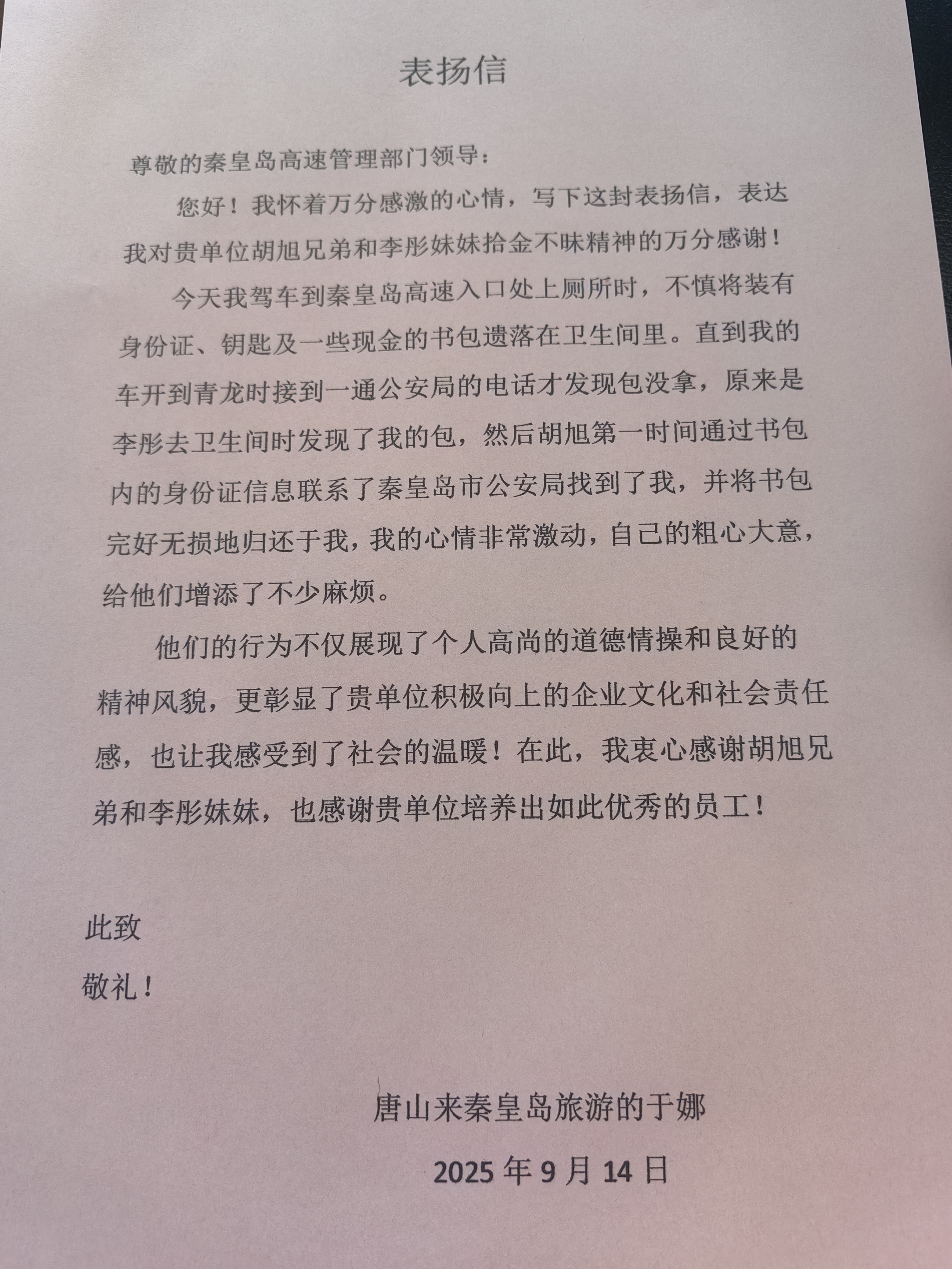 此次拾金不昧的善举,不仅体现了秦皇岛收费站员工良好的个人品德与职业素养,更用实际行动践行了“服务人民、奉献社会”的宗旨,传递了温暖人心的正能量。