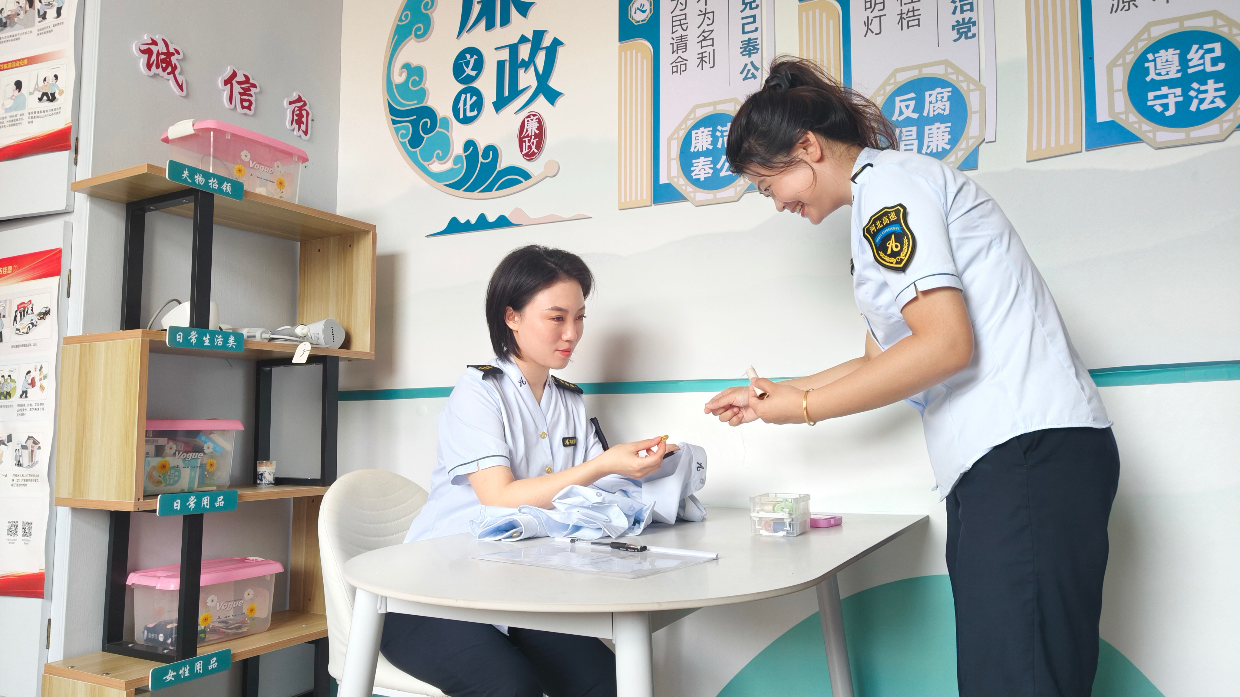 近日,京秦分公司北戴河收费站在廉洁工作站更新打造“诚信角”生活用品服务台,配备血压计、吹风机、针线以及日常非处方药品等50余种日常生活物资,以“按需取用、诚信归还”的管理模式为职工提供精准服务。职工们还主动将日常生活中多余物品如针线、纽扣等物品放置此处,实现物资循环利用。