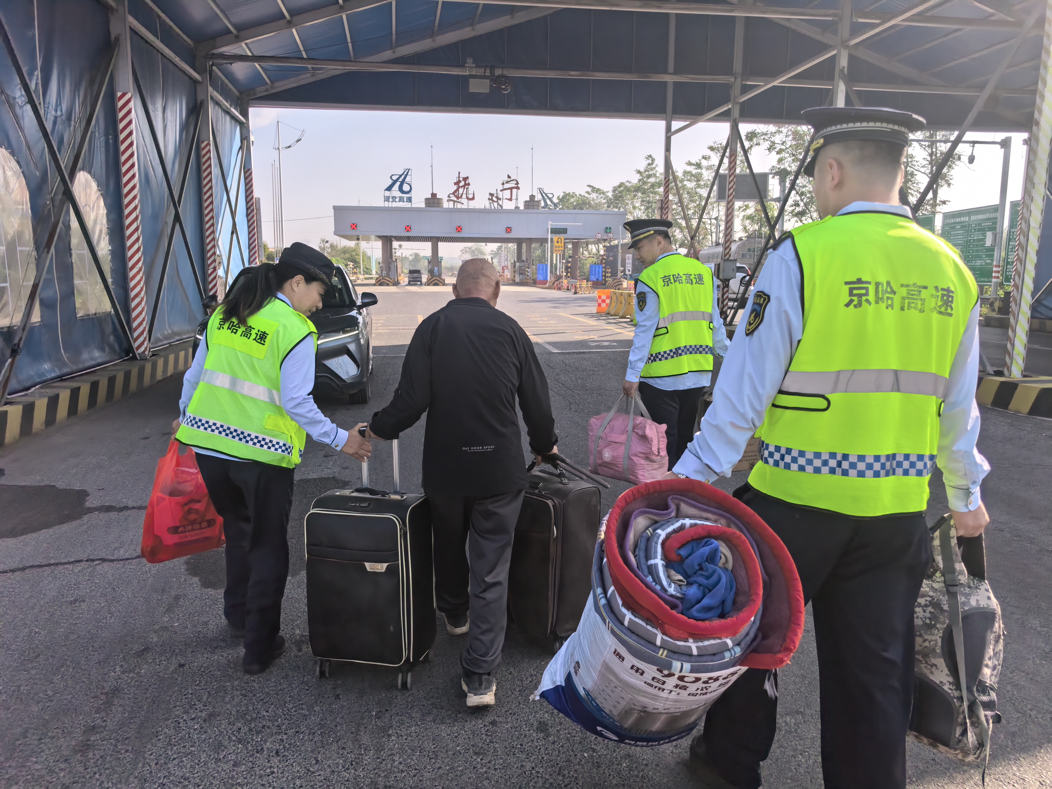 9月25日上午,京秦分公司抚宁收费站收费二班班长王俭宏与疏导员吴凡在安全巡查时,敏锐地发现一位老人在收费站外广场附近徘徊,手中提着多件沉重的行李,脸上露出迷茫和无助的神情。班长立即主动上前询问情况。