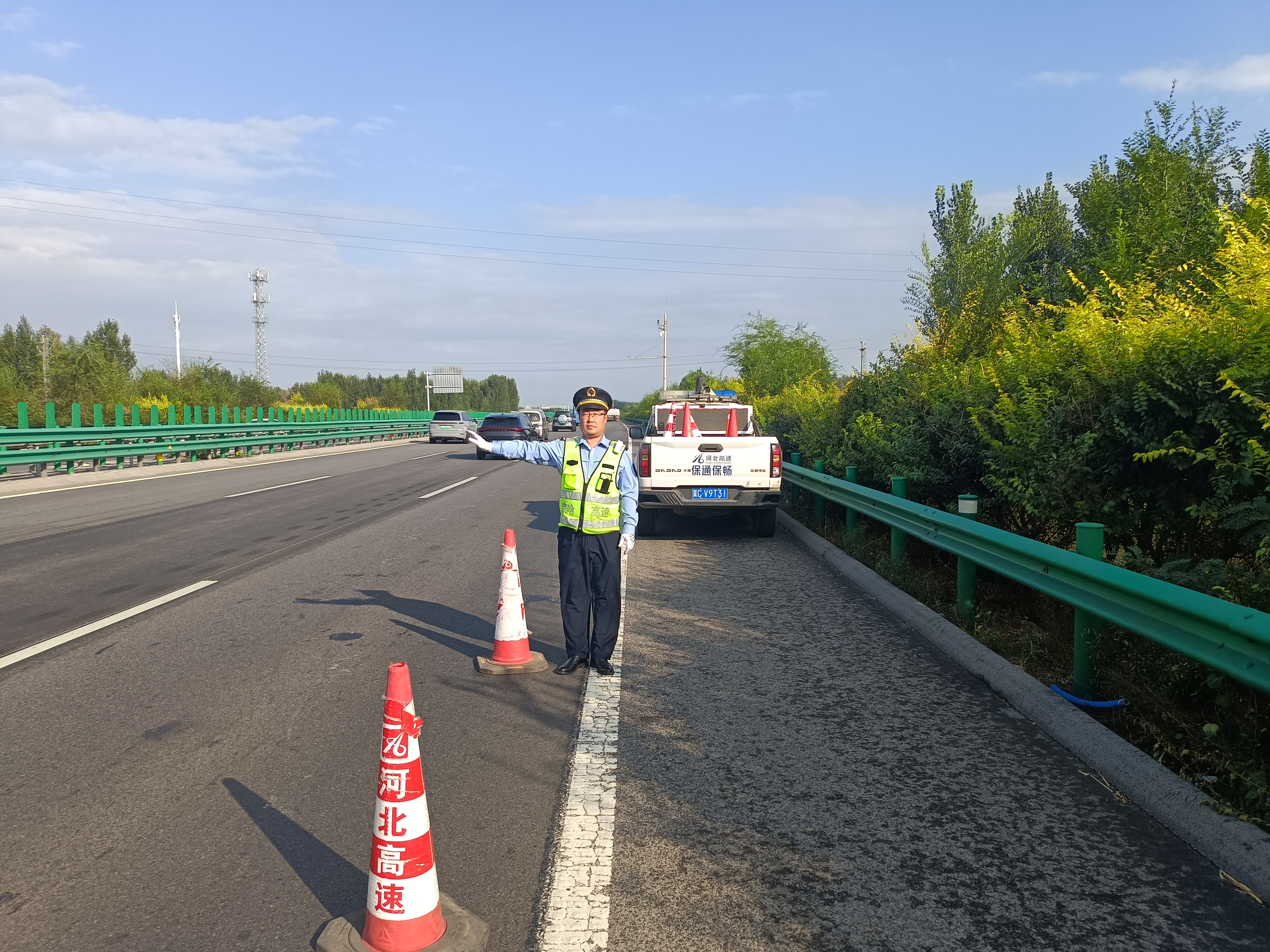 危急时刻,京秦分公司迁安保通保畅应急大队的刘鹏菲与刘佳航接到指令后迅速奔赴现场。面对车流密集、风险叠加的复杂情况,二人分工明确、行动果断:一人迅速在事故后方设置预警标识,用手势引导来车减速避让,为现场筑起“安全屏障”;另一人则快速穿梭于车流中,耐心疏导拥堵车辆,同时协助事故车主将车辆转移至应急车道,最大限度减少道路占用时间。