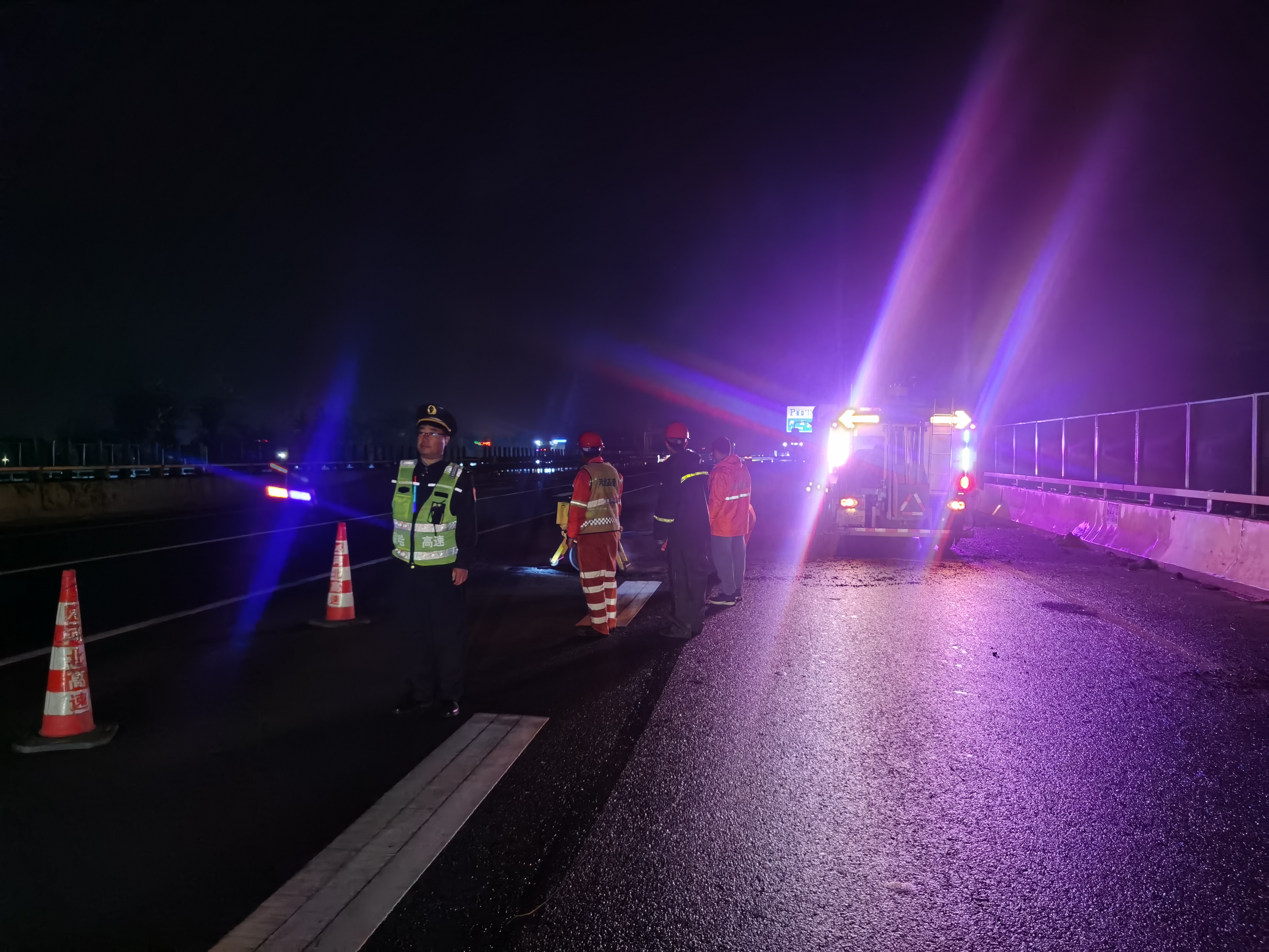 发现隐患后,队员立即行动:迅速摆放反光锥桶划定警示区域,同时开启车载警报系统、点亮车载显示屏,实时提示过往车辆减速慢行;同步联系迁安养护队,详细说明隐患位置,催促其尽快携带设备、材料赶赴现场处置。养护人员抵达后,应急大队进一步优化现场保障方案:一辆保障车在坑槽后方 300 米处开启警示灯、增设警示标志,引导车辆提前减速变道;另一辆保障车在维修作业区域周边驻点值守,全程守护养护人员作业安全,同时维护现场交通秩序,确保道路通行不中断。