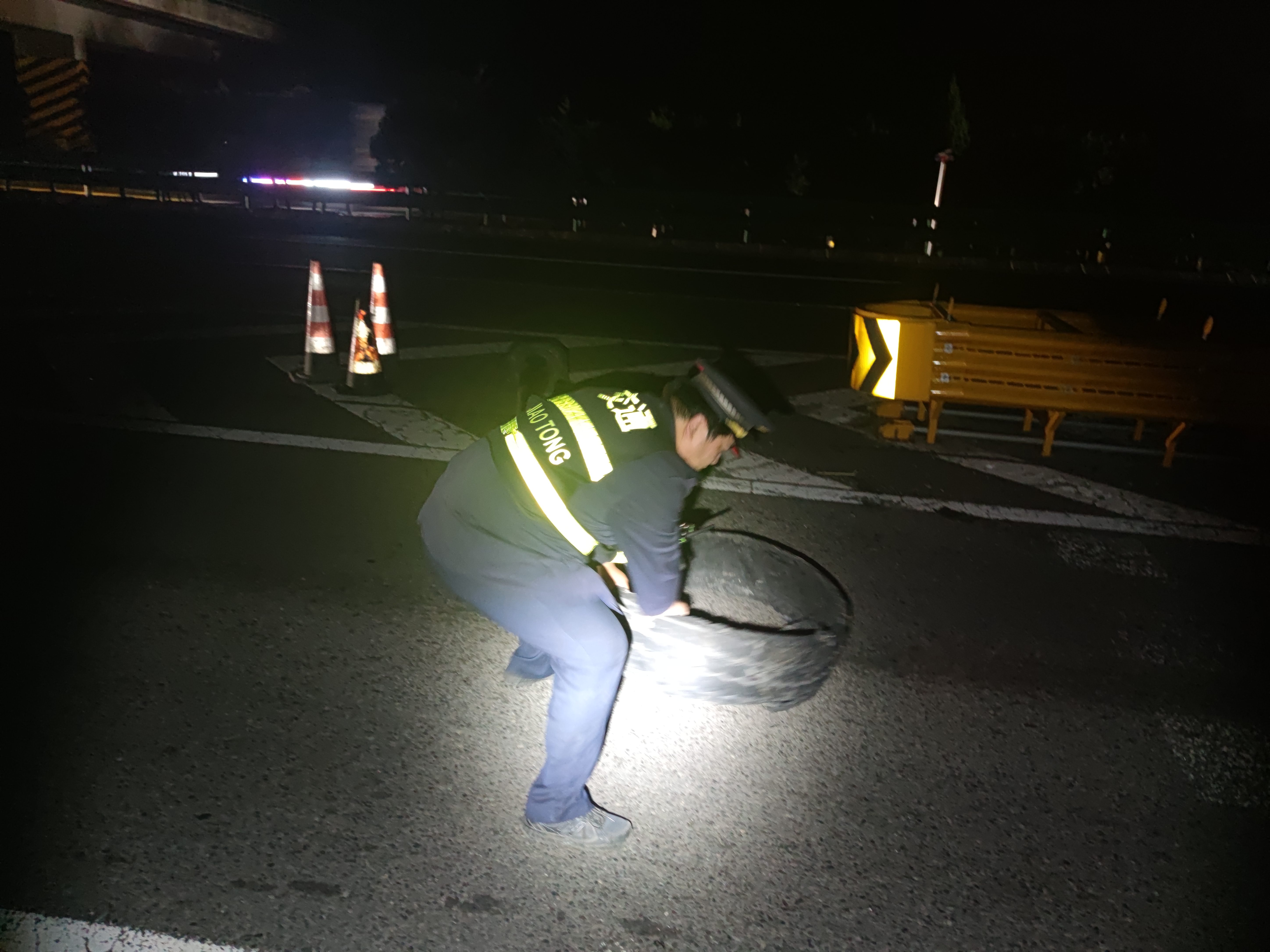 险情面前,疏导员没有丝毫迟疑,立即向当班班长详细汇报了隐患位置、形态及潜在风险。班长迅速启动应急处置预案,指令两名疏导员立即前往现场处置。二人接到指令后,迅速穿戴好反光服、佩戴爆闪灯等全套安全防护装备,携带手电筒等照明工具快速赶赴隐患地点。到达现场后,他们首先对周边交通状况进行观察,在确保自身安全和不影响车辆正常通行的前提下,分工协作,一人负责观察来车方向,做好安全预警,另一人快速将废旧轮胎拖拽至路边安全区域。整个清理过程紧张有序,仅用几分钟便完成了隐患处置,及时消除了潜在风险。