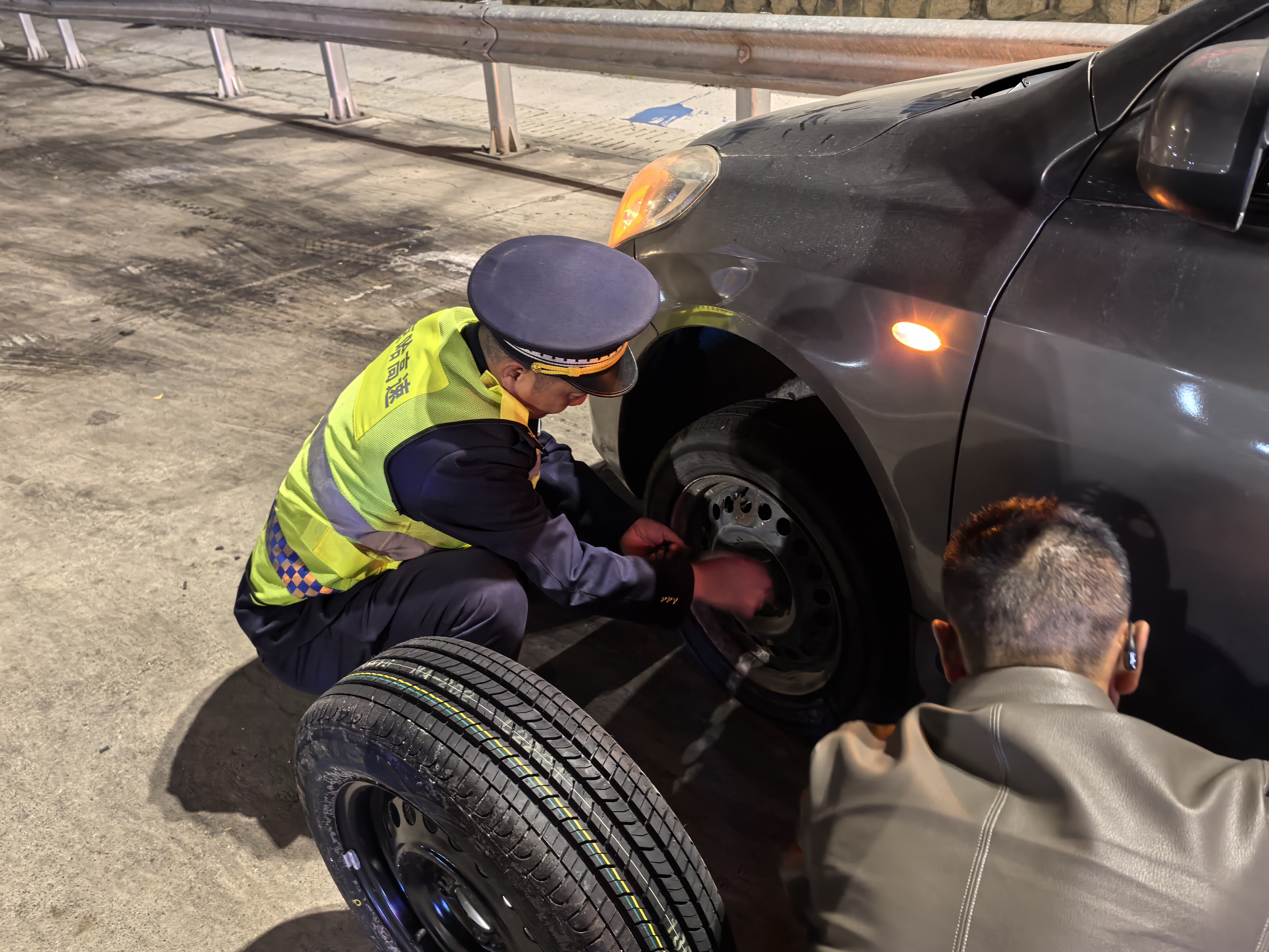 从稳妥架设千斤顶、拆卸破损轮胎,到认真安装备胎、逐一紧固螺丝,班长动作麻利、操作专业,整个过程与司机配合顺畅。不过十几分钟,原本停滞的车辆便恢复了行驶能力。临行前,他还特意叮嘱司机:“备胎只是临时应急用的,您抓紧时间去附近维修点把轮胎补好,路上注意安全。”司机连声道谢。