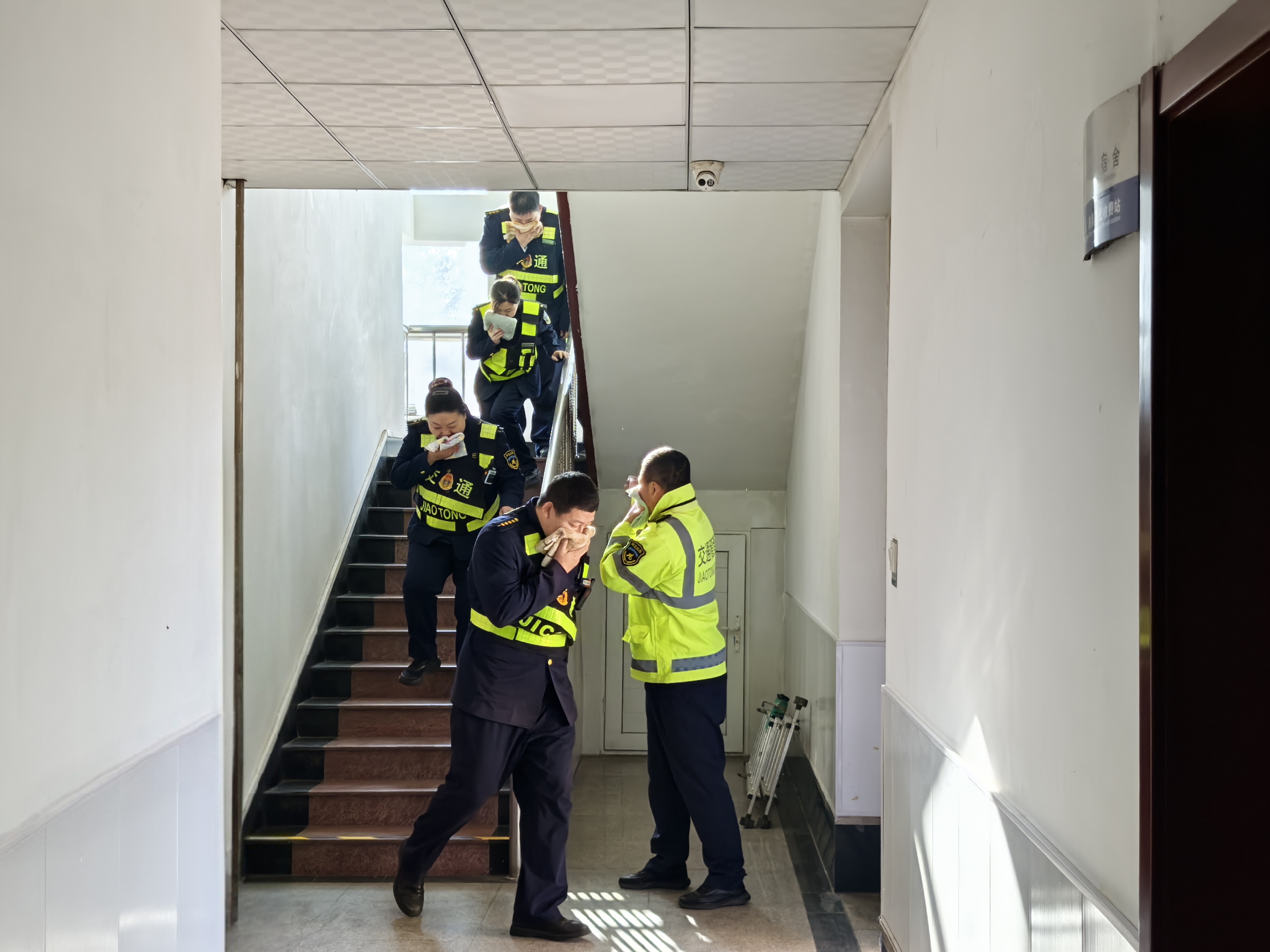 随着模拟火灾警报声的响起,应急疏散演练正式启动。办公楼内的员工用湿毛巾捂住口鼻,弯腰快速沿安全通道向室外指定安全区域撤离。到达安全区域后,负责人迅速清点人数,确认无人员遗漏后第一时间向演练总指挥汇报。整个疏散过程紧张有序、衔接顺畅,仅用时1分40秒便完成全部人员安全撤离,充分展现了职工良好的应急反应能力。