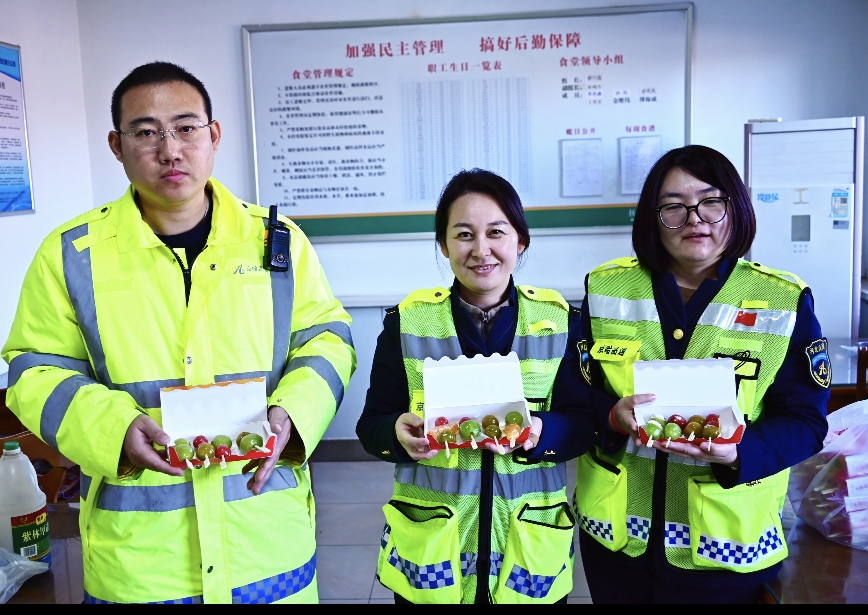 刚出锅的冰糖葫芦第一时间送到职工手里,外脆里嫩、酸甜交织的滋味驱散了冬日疲惫,让集体温暖直抵心间。同时,职工们化身“暖心使者”,将甜蜜与问候分享给过往司乘,收获连连称赞:“收费站太贴心了,这口甜暖到心坎里!”