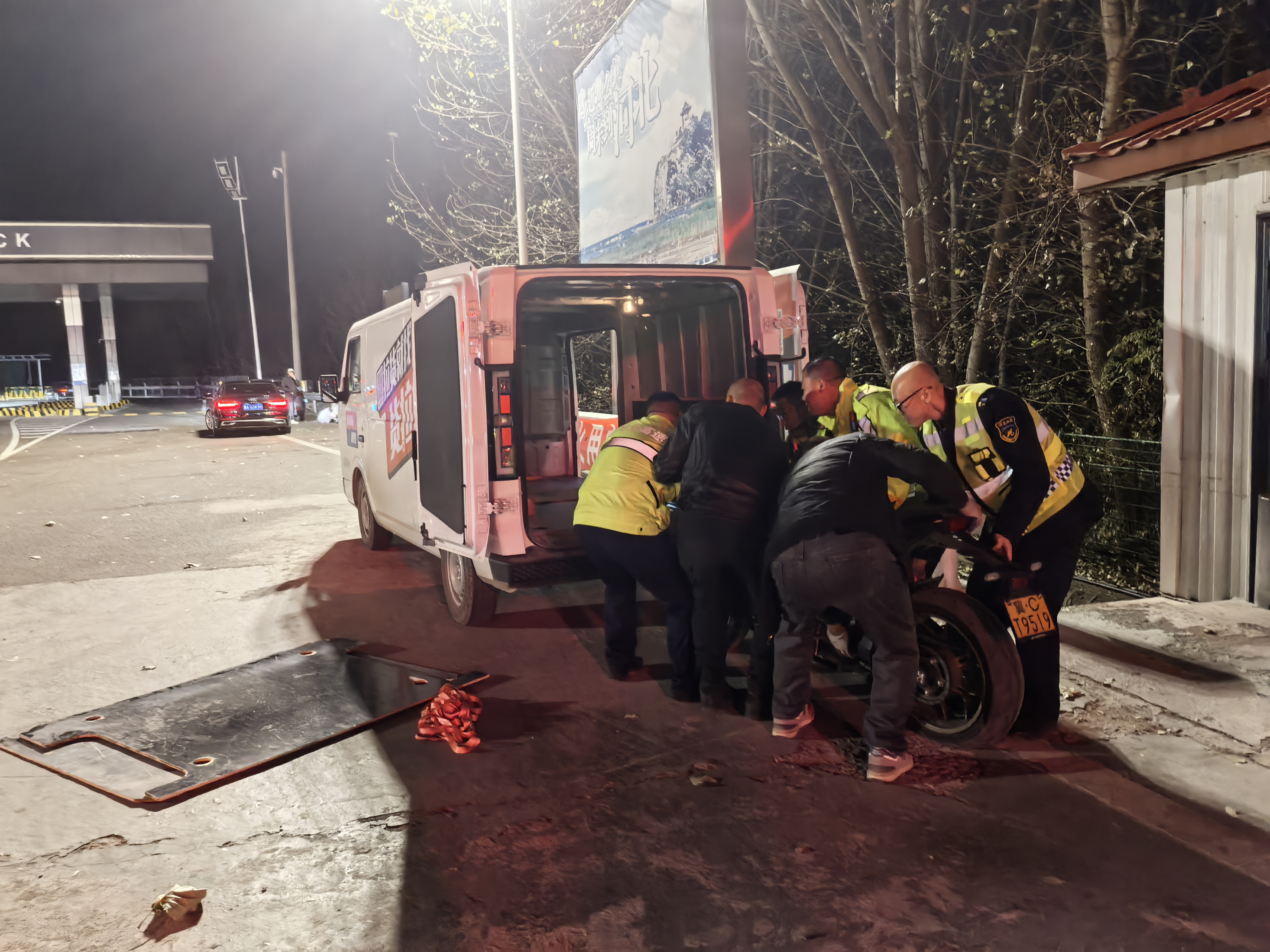裴守明见状立即喊来正在休息的工作人员,又找来临时的垫块,防车辆打滑。几个人一起小心地扶着车把、抬着车尾,慢慢把摩托车挪到联系好的救援厢式车旁,合力把车抬进车厢里,还特意帮车主固定好车辆,避免运输时磕碰。等车主跟着救援车离开时,还在车窗外朝着工作人员道谢。