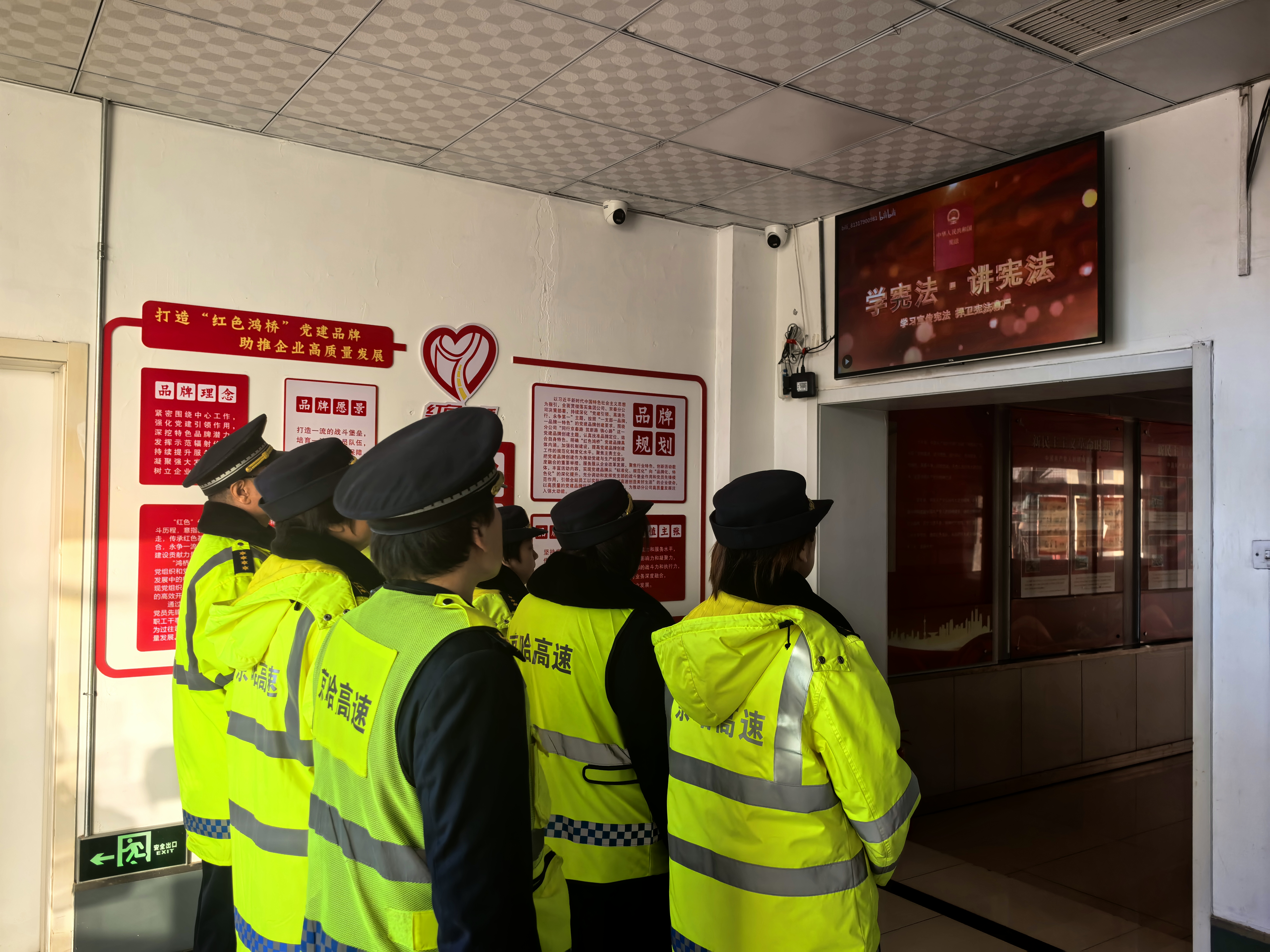 活动伊始,收费站领导班子将宪法宣传作为强化行业治理、提升队伍素养的重要政治任务,高位部署、周密谋划。召开专题会议,结合高速收费服务特性,明确“内部强素养、外部普常识、长效促提升”的工作思路,细化分工、压实举措,保障活动有序有力推进。同时激活站内宣传阵地,开设宪法专题宣传栏,通过LED显示屏24小时滚动播放主题标语,打造沉浸式宣传环境,让宪法精神潜移默化融入日常工作与出行服务。