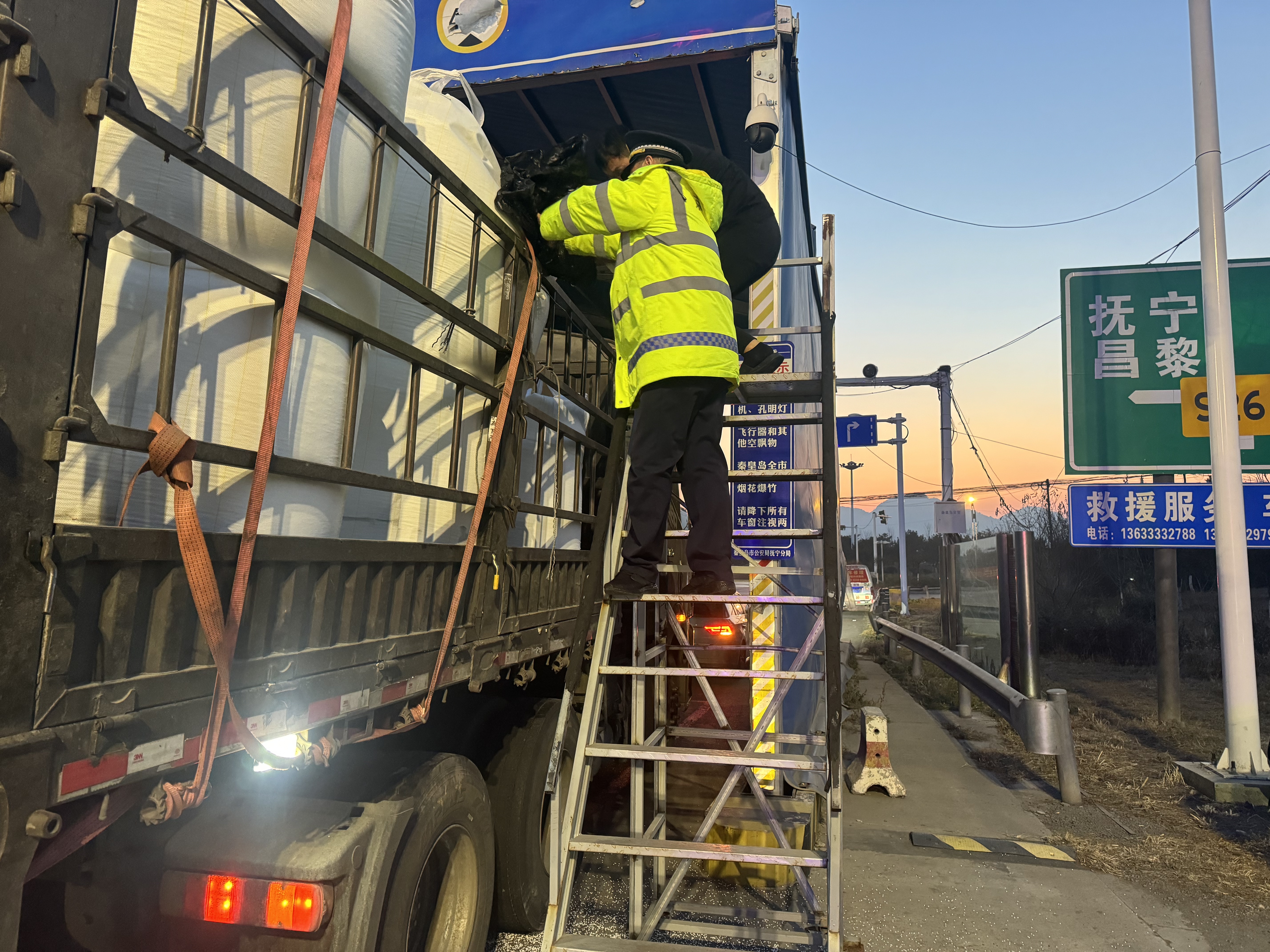12月12日,京秦分公司抚宁收费站内广场绿通查验区,一辆满载货物的货车在运输过程中货物散落,收费一班疏导人员快速响应,协助整理,赢得司机赞扬。