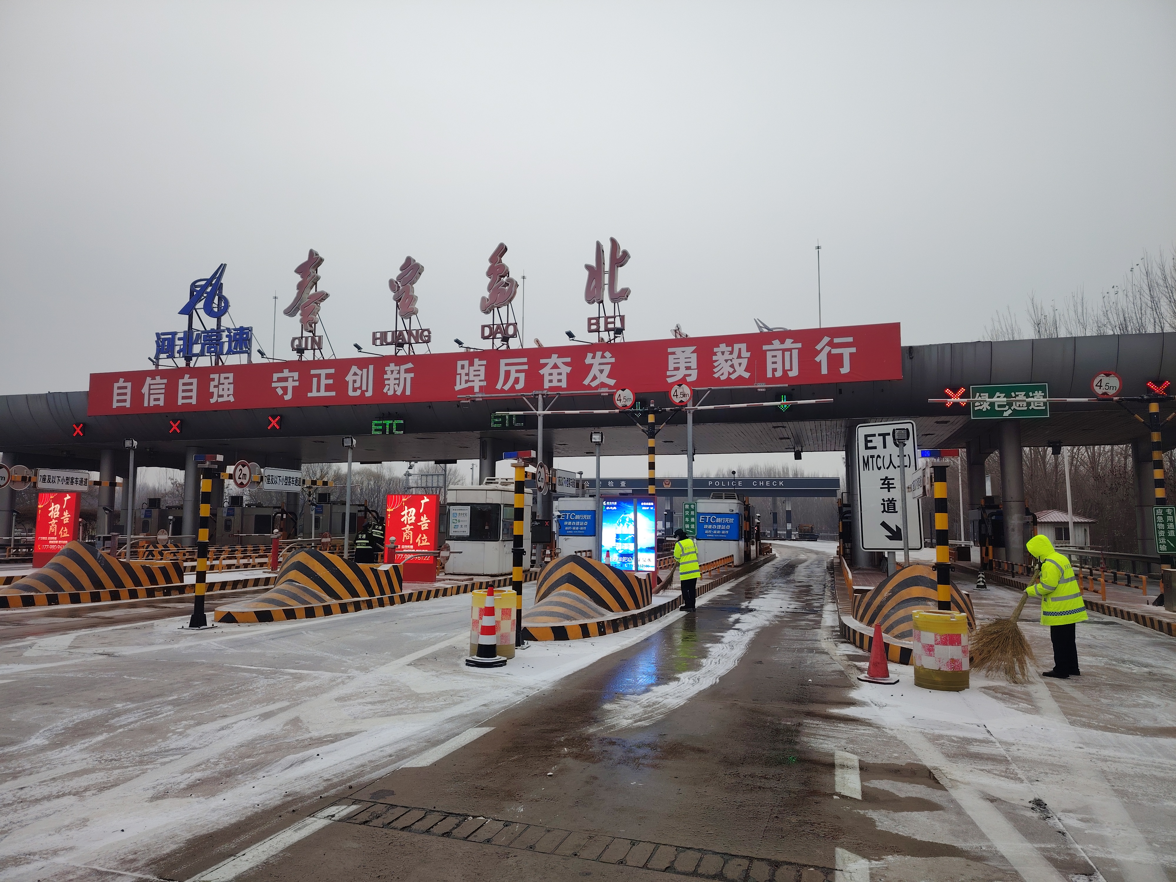 降雪伊始,秦皇岛北收费站立即启动除雪保畅预案,按照“先车道、后广场,先主道、后辅道”原则,分工协作开展作业。大家手持雪铲、扫帚顶风冒雪,对收费车道、广场及出入口匝道的积雪进行清扫,防止路面结冰打滑。收费窗口工作人员坚守岗位,快速高效保障司乘通行,减少车辆停留时间;疏导人员做好车道疏导,引导车辆有序通行,提醒司乘减速慢行、保持安全车距。