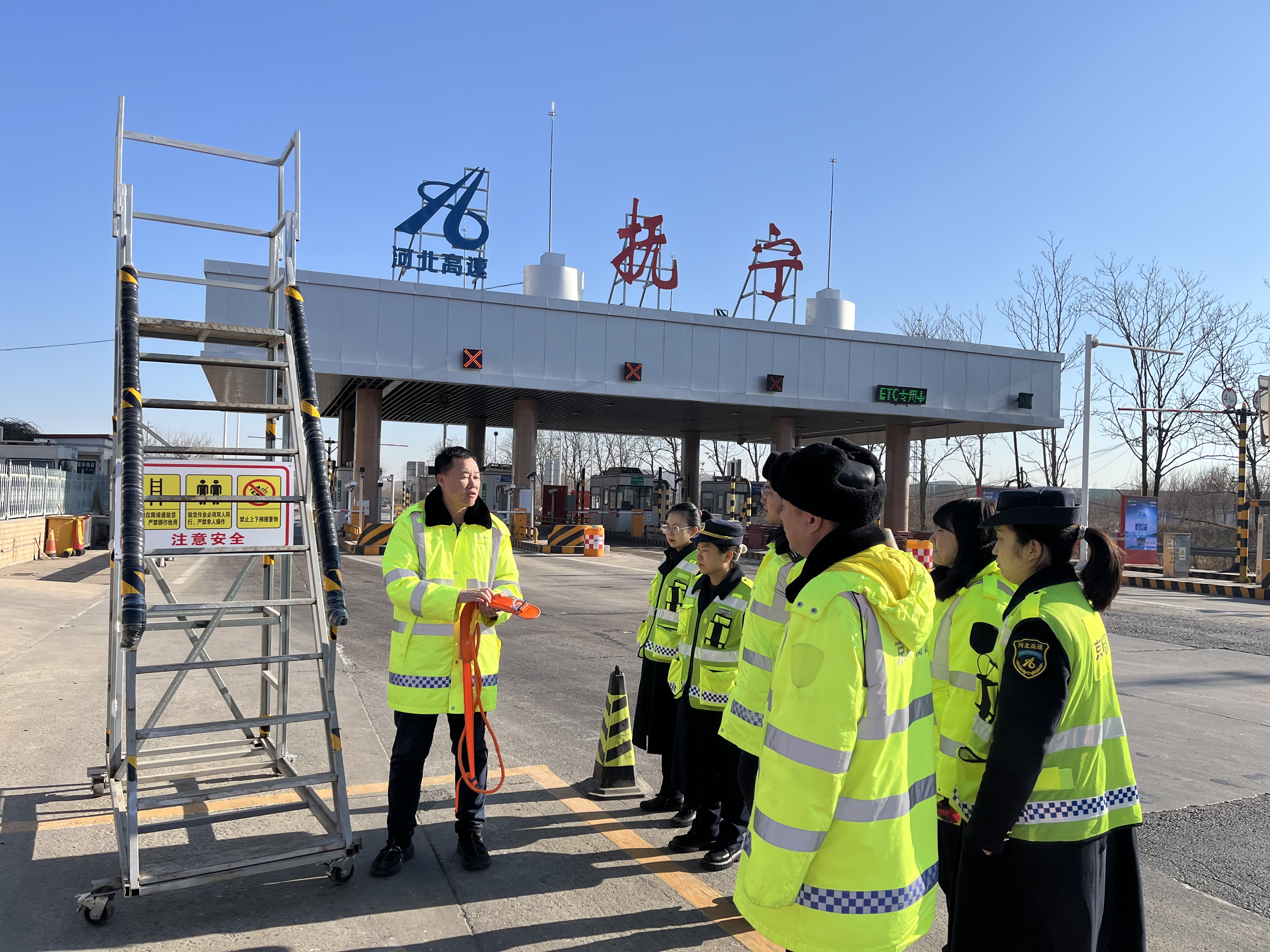 针对绿通查验专用高梯存在的安全隐患,收费站及时对高梯进行加固处理,确保梯体结构稳定。在高梯前后醒目位置加装警示标牌,明确“双人查验、禁止携物攀爬”等操作要求,让安全提示直观易懂。同时为参与绿通验货的收费人员配备安全帽、安全带等防护用具,从硬件配置上降低高空作业风险。