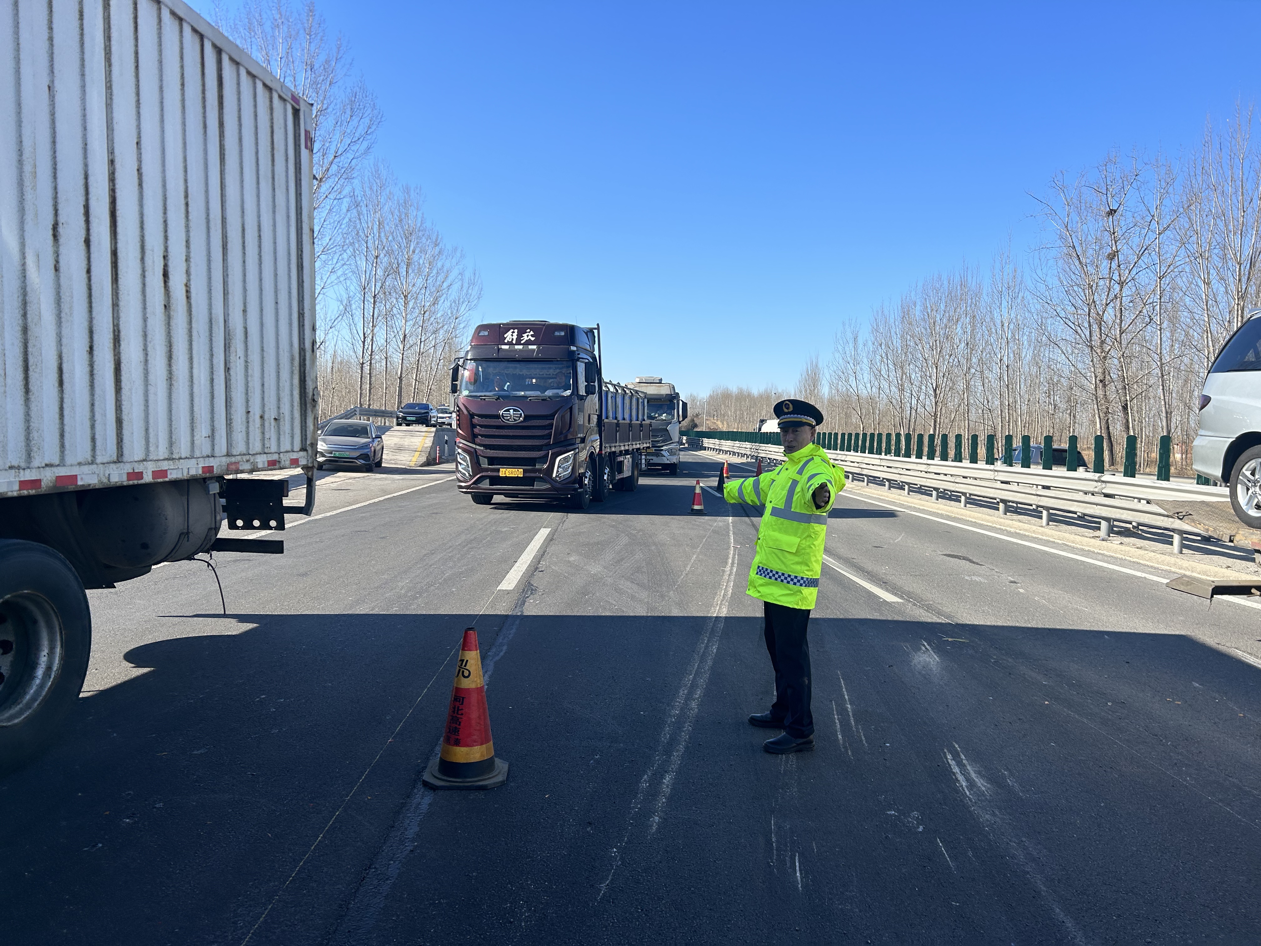 迁安保通保畅应急大队迅速赶赴现场。在距离事故点约4公里处遭遇严重拥堵,值班领导果断指挥,兵分两路:一路人员下车疏导车流、腾出空间;另一路驾驶应急救援车辆,为后续清障车开辟通道。救援力量快速突破拥堵,抵达现场。