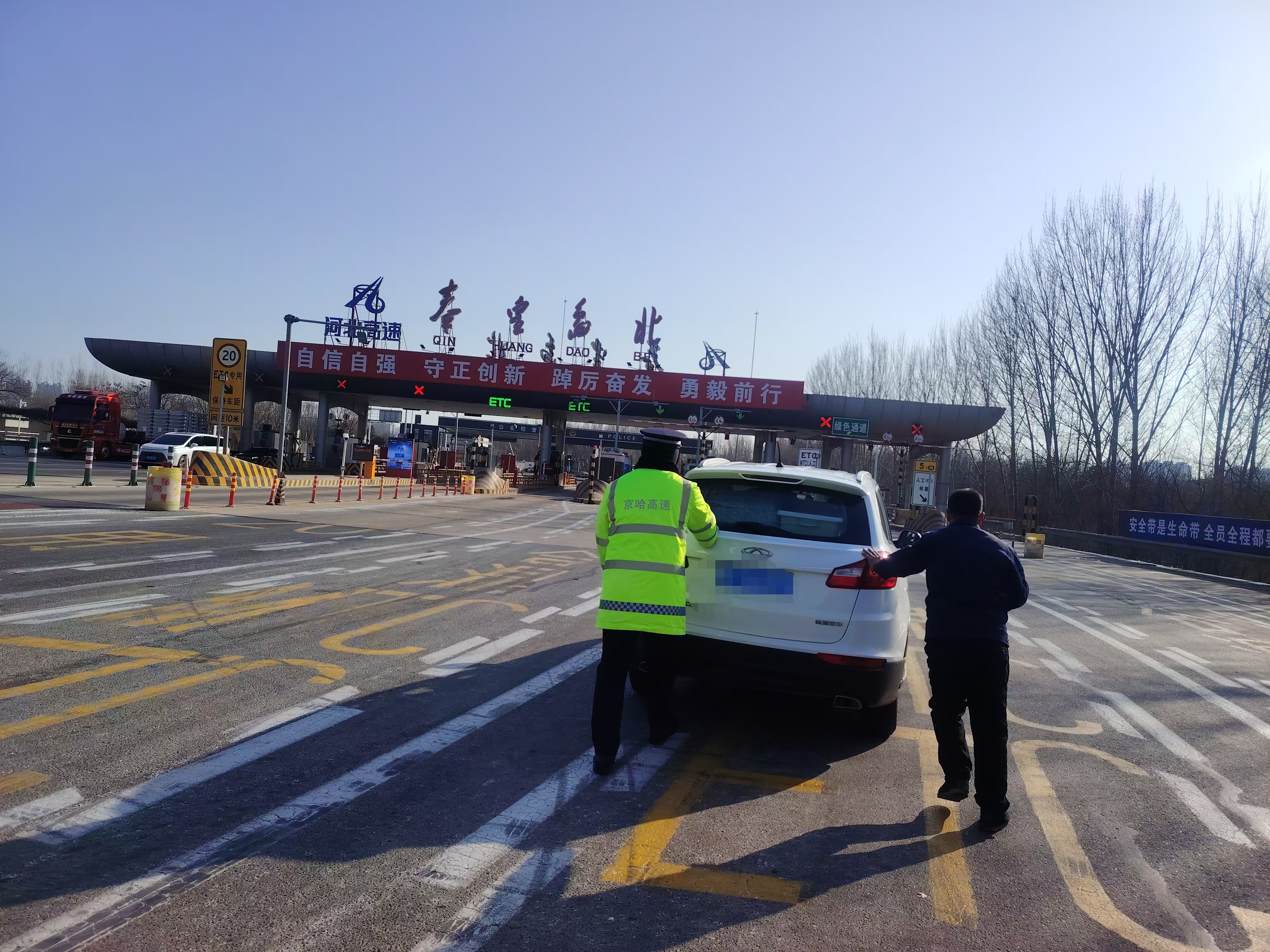 1月26日下午2时3分,京秦分公司秦皇岛北收费站的收费窗口前,一位交费的司机匆匆反映,收费站引道内有车辆故障,司机正独自推行车辆,急需帮助。