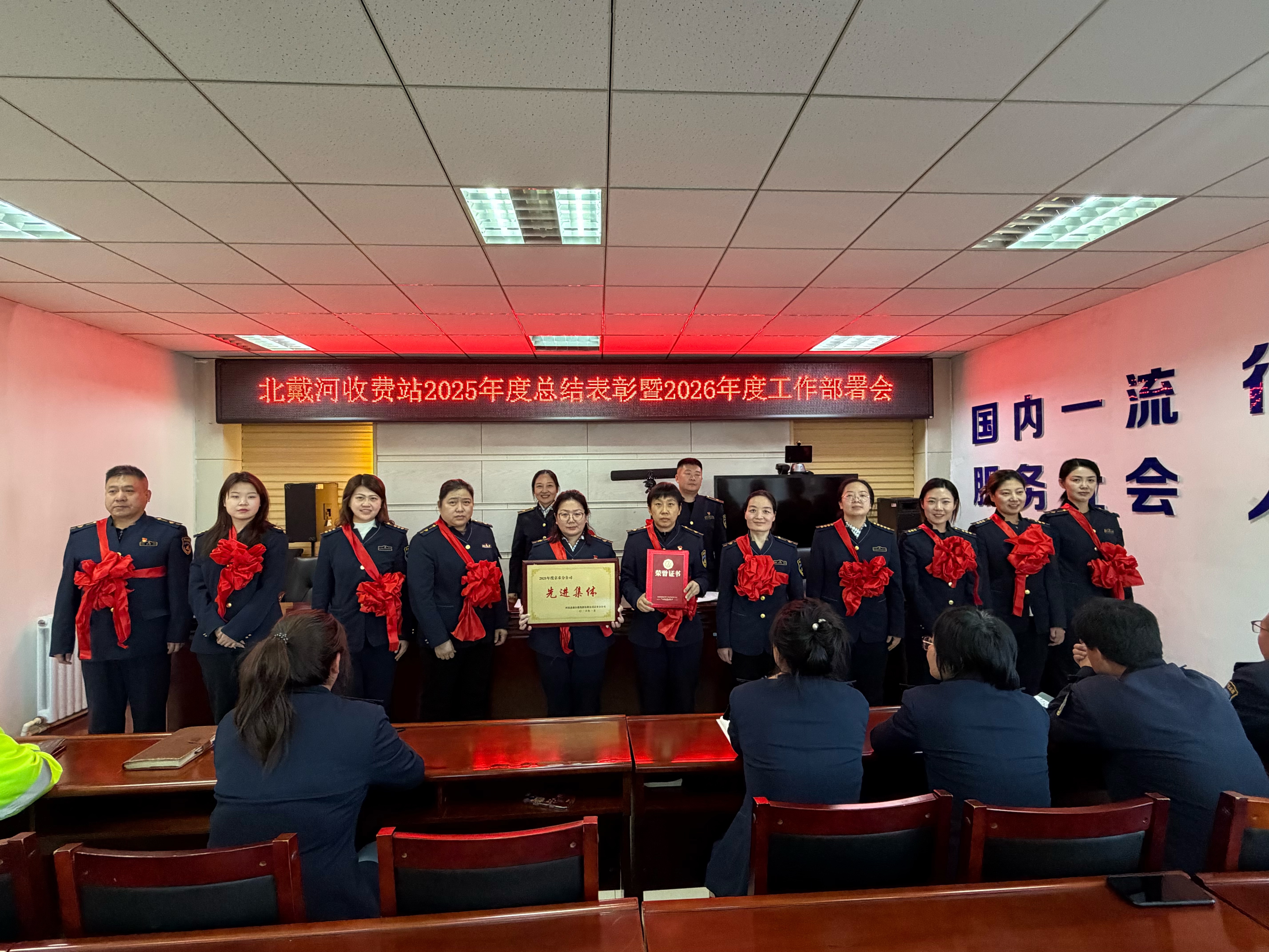 2月2日,京秦分公司北戴河收费站召开2025年度总结表彰暨2026年度工作部署会,全面总结2025年各项工作成效,表彰先进典型,部署2026年重点任务,并就春运保障工作进行再动员、再强调。收费站全体员工参加会议。