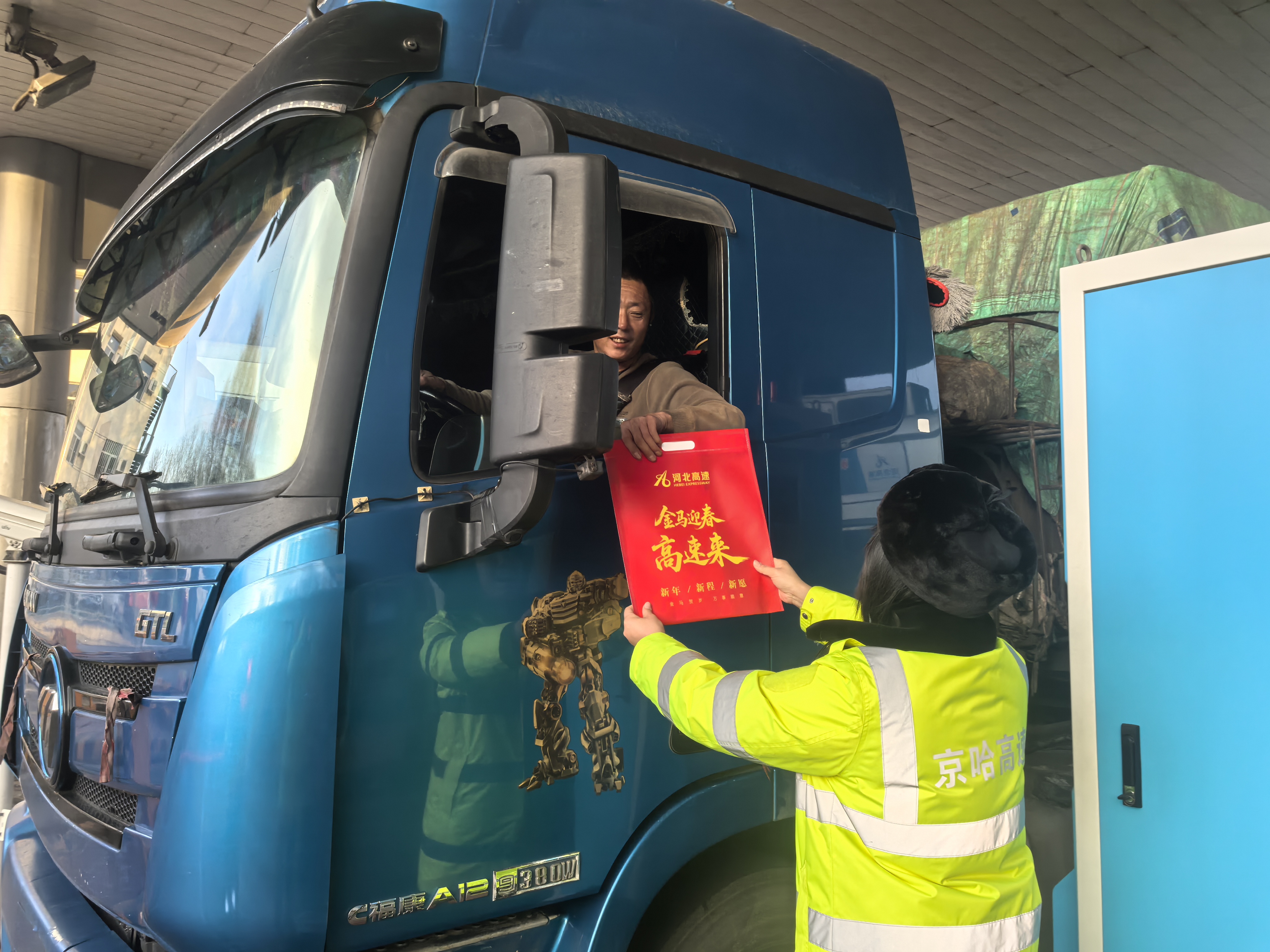 站区内外年味十足,大红灯笼高高悬挂,吉祥福字、新春装饰相映成趣,让每一位驶入收费站的司乘都能感受到扑面而来的新春气息。为让奔波在返乡途中的旅客感受高速温情,收费员们在保障车道安全、有序、高效通行的同时,热情为过往司机送上新春礼包与节日问候,一句句“新春快乐、一路平安”的真挚祝福,温暖着每一段归途,也让匆忙的旅途多了一份安心与暖意。