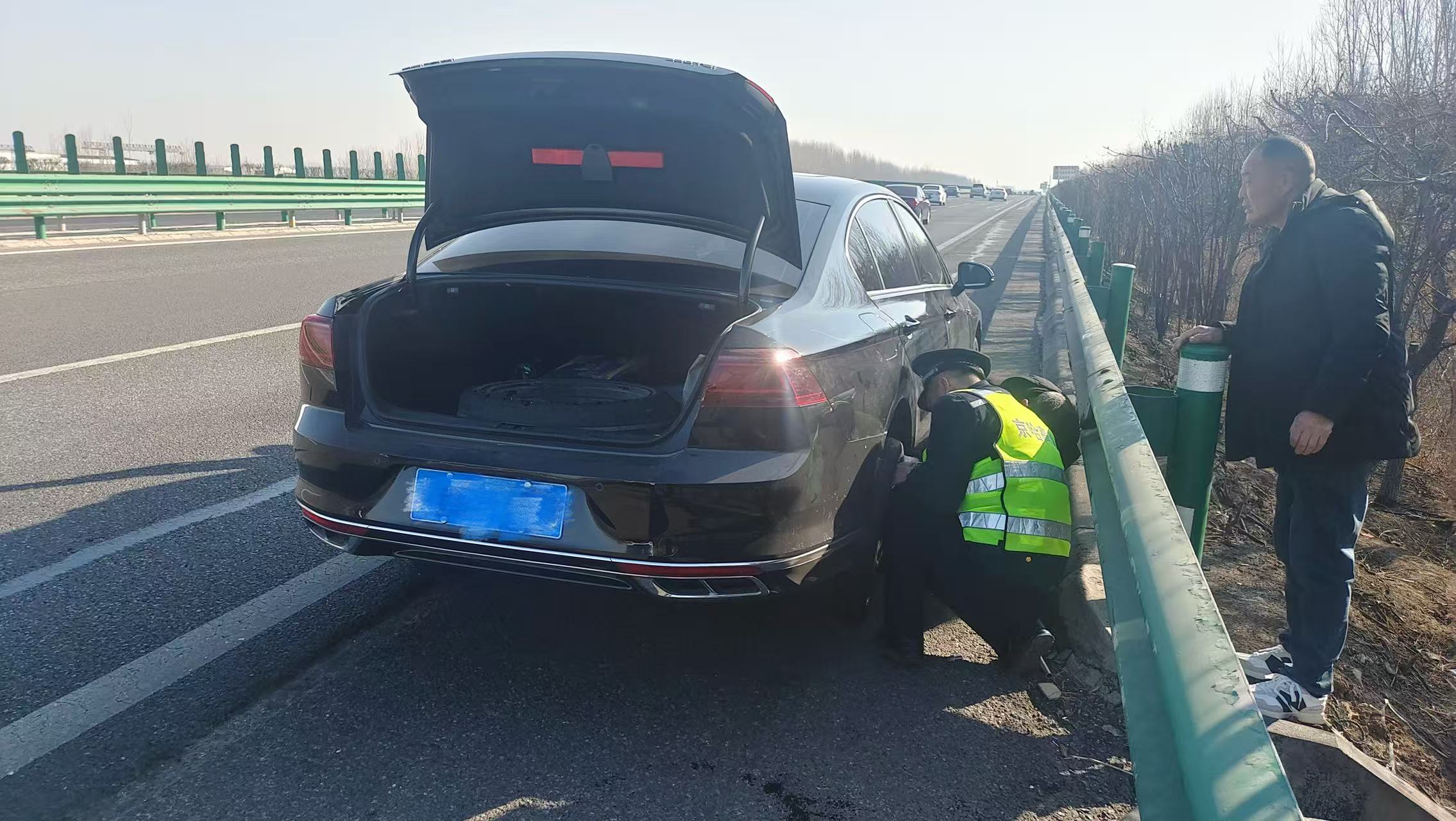 2月19日,春运出行高峰,京哈高速唐山段车流密集。京秦分公司唐山保通保畅应急大队坚守一线开展常态化巡查,9时45分,在沈阳方向K121公里处发现一辆小轿车停靠应急车道,司乘人员因车辆爆胎束手无策,存在极大安全隐患。