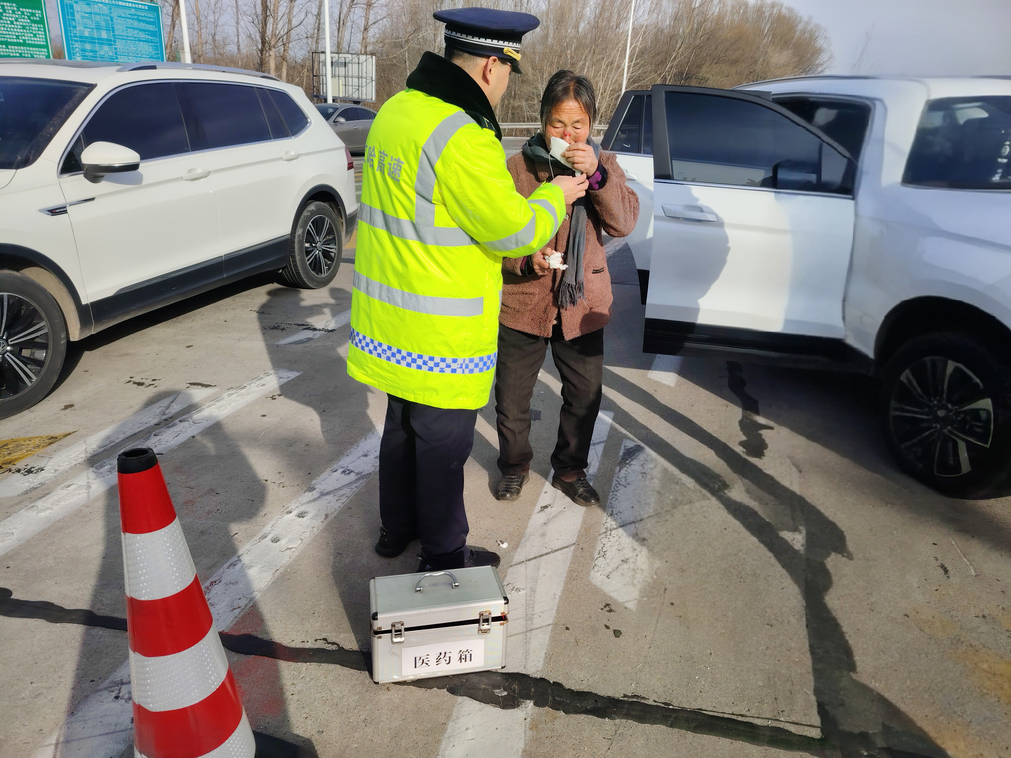 事故发生后,石磊立即上前查看情况,迅速取来站内医药箱,为受伤司乘人员进行消毒、包扎等简易处理,随后将伤者妥善安置至站内休息厅休息,同时协助做好现场秩序维护,等待救援人员到来。整个处置过程快速、规范、有序,充分展现了高速职工恪服务为民、勇于担当的良好形象,以实际行动守护司乘人员出行平安。