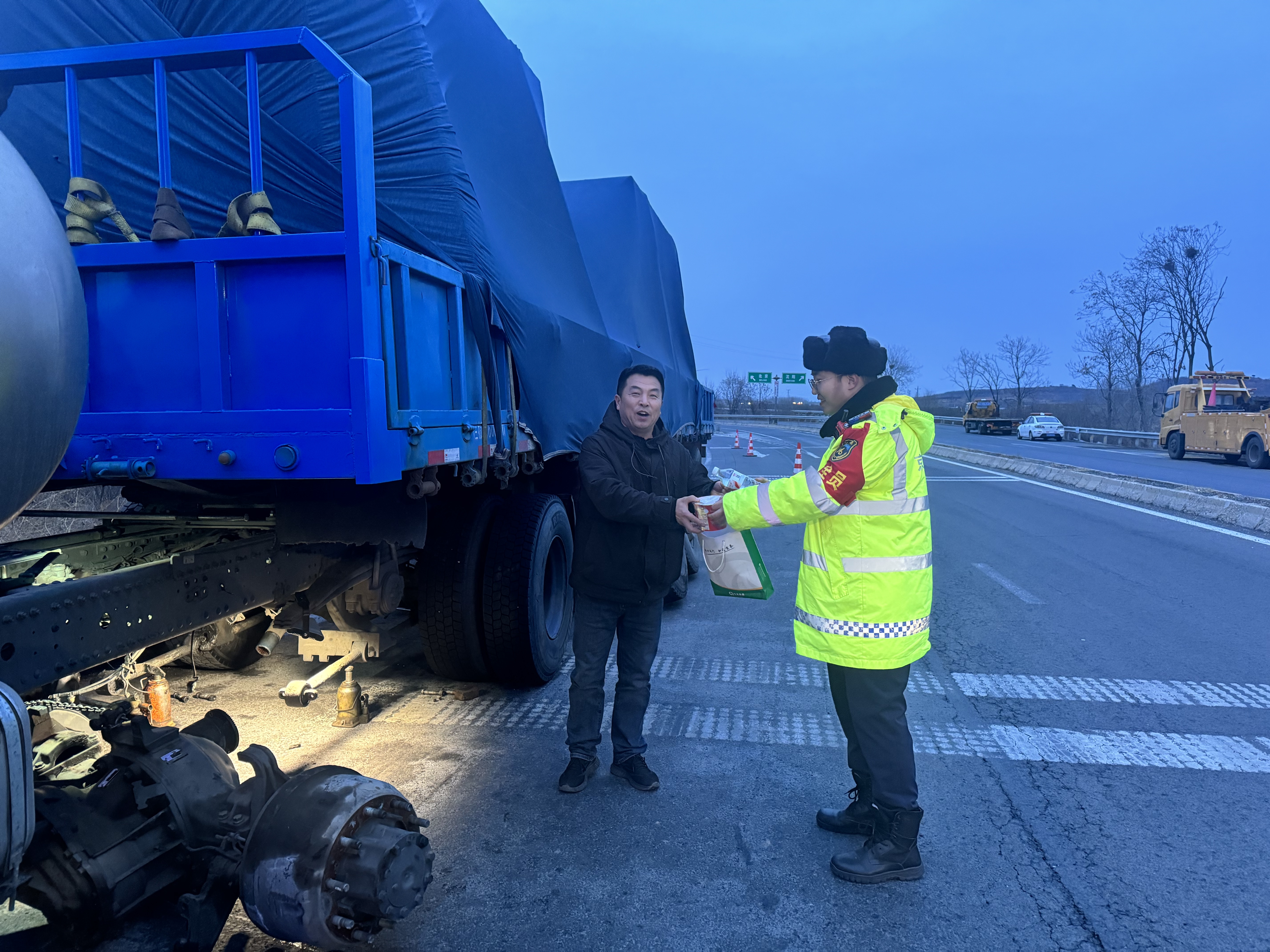 2月26日18时,正值抚宁收费一班值岗,班长孙明昊及疏导员进行日常巡逻时,发现内广场停着一辆故障货车,司机师傅正顶着寒风检修车辆,恰逢饭点仍未进食,值岗人员及时送去热面,用贴心服务温暖司乘旅途。