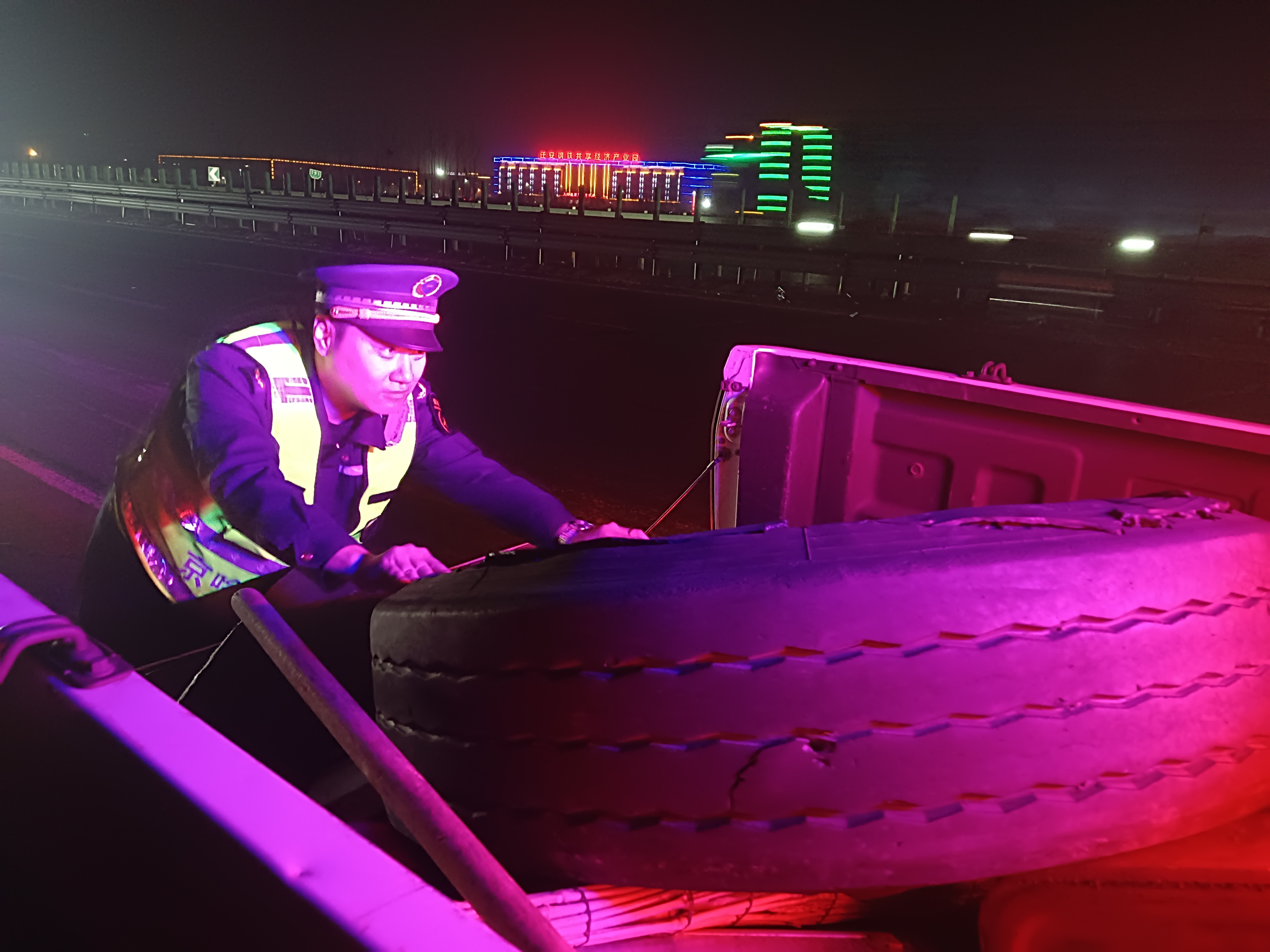 4月3日19时20分许,大队巡逻人员在沈阳方向K191公里处例行巡查时,突发发现路面隐患。一只轮胎倚靠在中央隔离带边缘,状态极不稳定,一旦倾倒滑落,极易闯入超车道,对高速行驶的车辆形成严重风险。