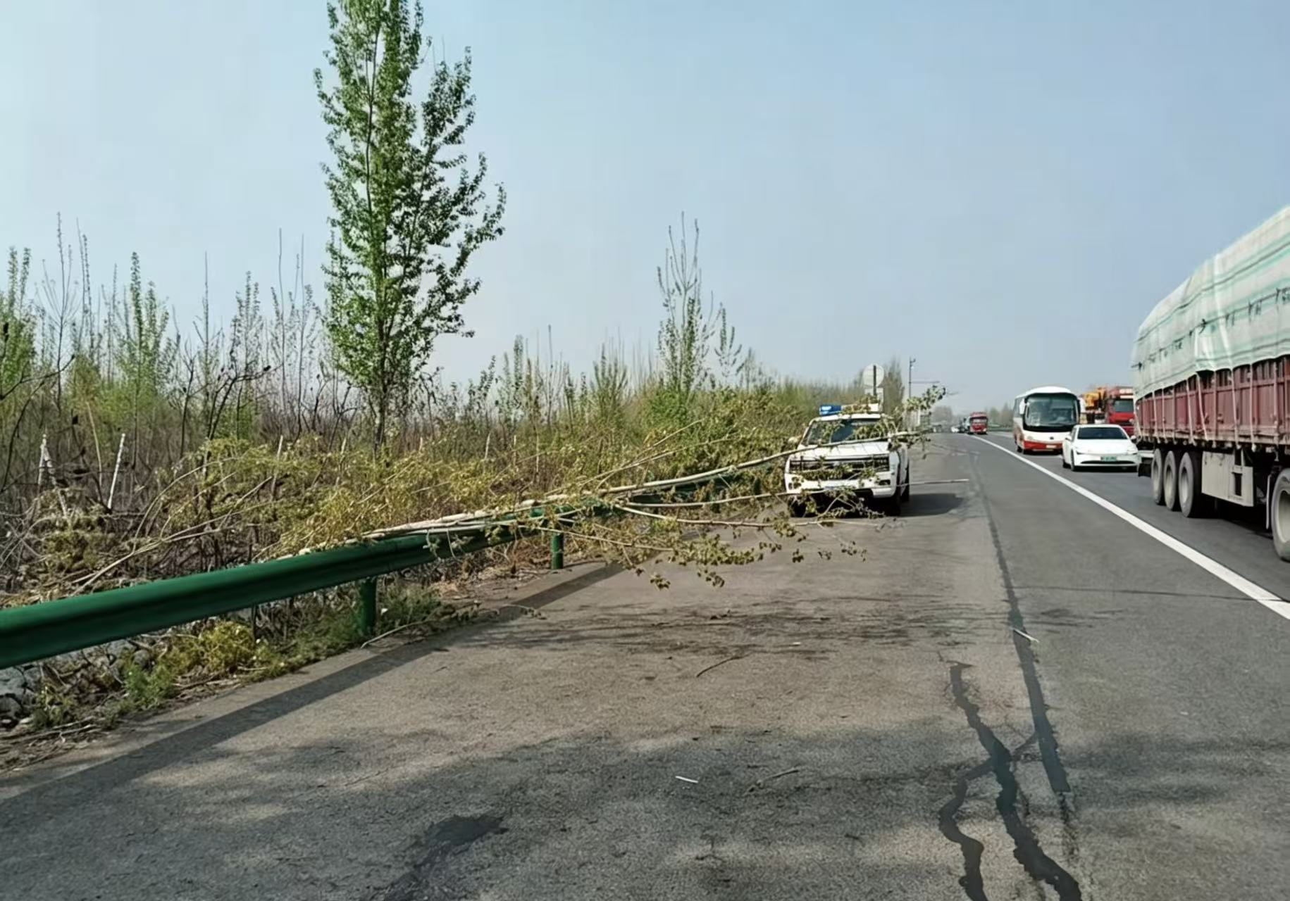 4月12日9时18分,G1京哈高速沈阳方向K164+300公里处,受大风天气影响,路边树木发生倒伏,部分枝干侵入应急车道,对道路通行秩序及司乘人员出行安全存在一定影响。
