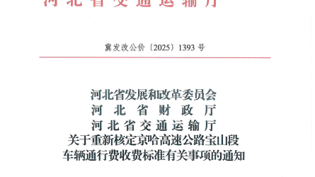 委员会、河北省财政厅、河北省交通运输厅审核批准,对车辆通行费收费标准进行重新核定。现就京哈高速公路宝山段车辆通行费试行收费标准执行事宜公告如下: 一、执行时间 自2026年1月9日零时起执行。 二、车辆通行费...[详细]
